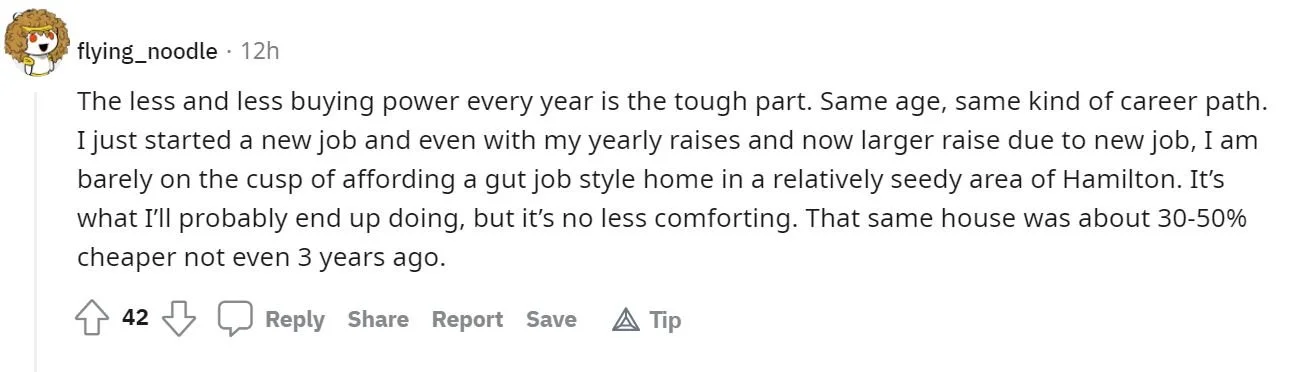 We could understand if rapid price appreciation were confined to prime real estate in downtown Toronto or even the broader GTA. But this is simply not the case. The user above described their area as rural. The user below describes a “relatively seedy area of Hamilton”.